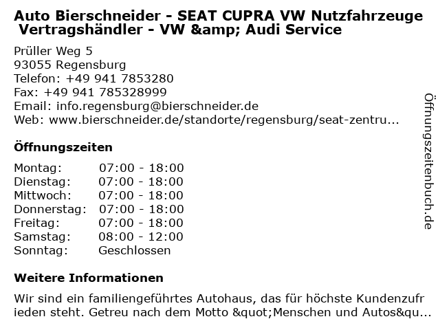 Auto bierschneider gmbh prüller weg 5 93055 regensburg unser betrieb route planen. Entdecken sie unseren umfangreichen seat vw audi jeep alfa romeo fiat abath fahrzeugbestand. 08 30 18 00 uhr.